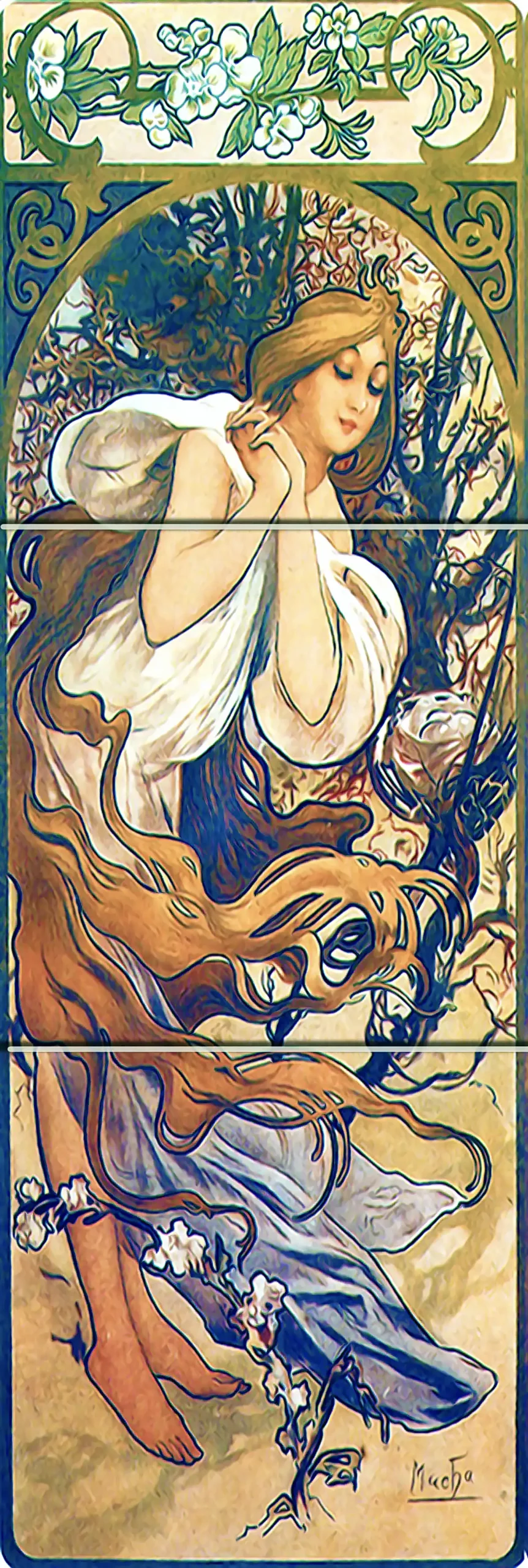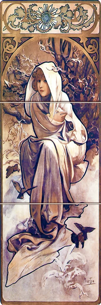 The famous Four Seasons of Alphonse Mucha Art reproduced on ceramic tiles 15 cm wide by 45 cm high each season.