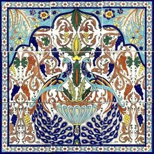 The Peacocks of Chagall tile murals was a creation of my mother, Marie Balian. She came up with this spectacular tile design in memory of the visit of Marc Chagall’s actual visit to our unique Balian tile studio in the mid-80s. Mr. Chagall came to the studio with the then-mayor of Jerusalem, Teddy Kolek, and sat at my mother's painting table to paint a single 15×15 cm ceramic tile. In the middle of the painting, with TV and his entourage looking on, he hesitated with one color. My mother told Mr Chagall … in French …” Don’t you think if you put Brown here it will be better?”. After a few seconds of total silence at the statement of mother to one of the most famous artists of his era, he replied, ” vous ave raison madame” and continued with the brown ceramic color at the relief of the entourage. We fired the ceramic tile, and the next day he came and picked up the tile himself, thanking my mother and the Balian tile studio.