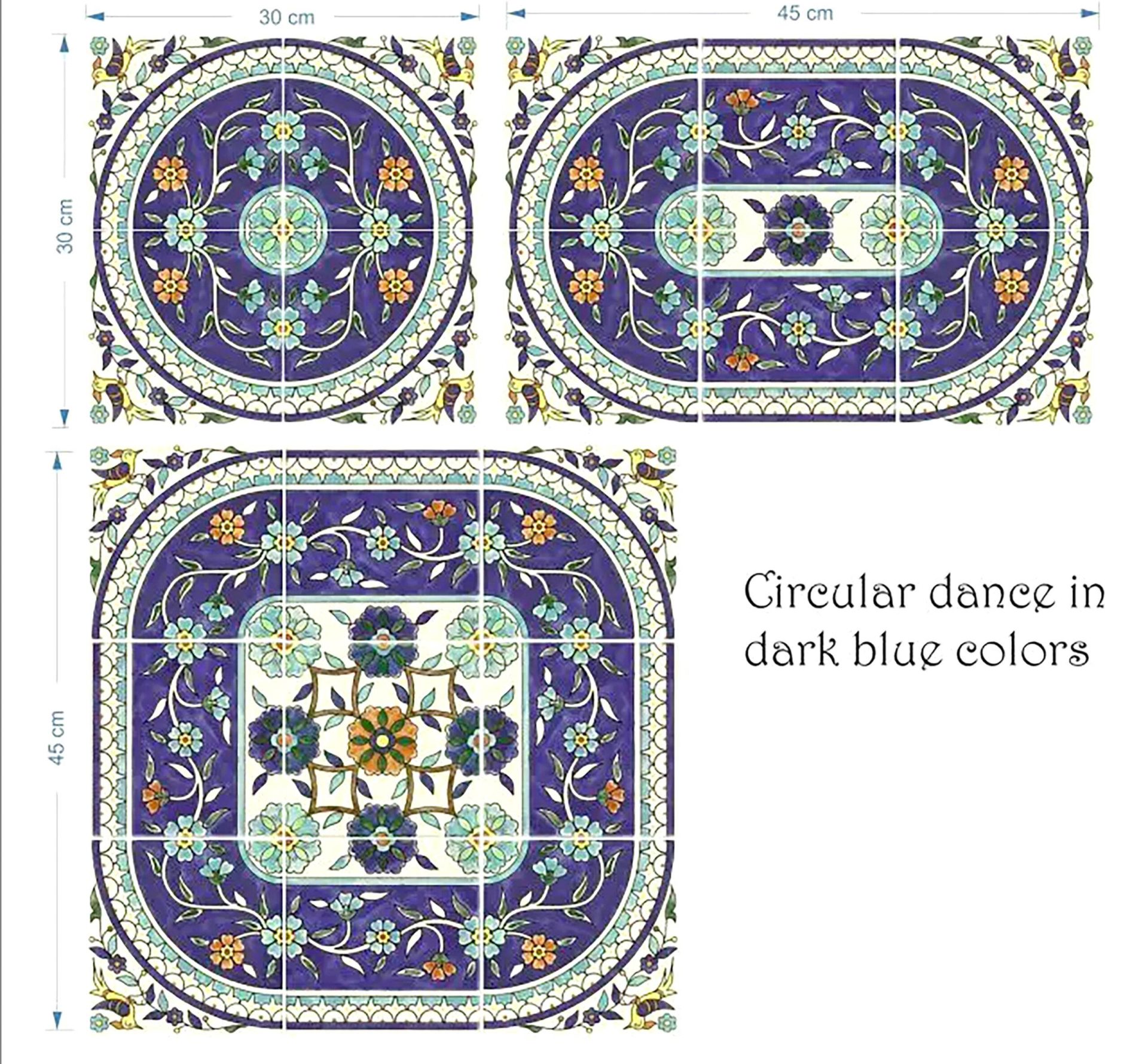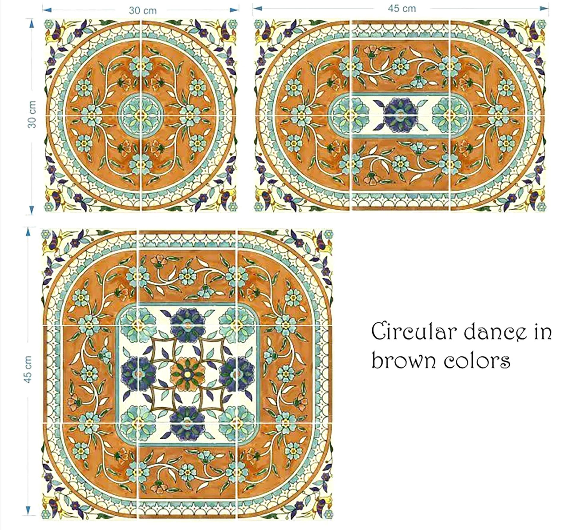 Floral Decorative Tiles: Vibrant patterns in multicolor, blue, black/grey, and brown.