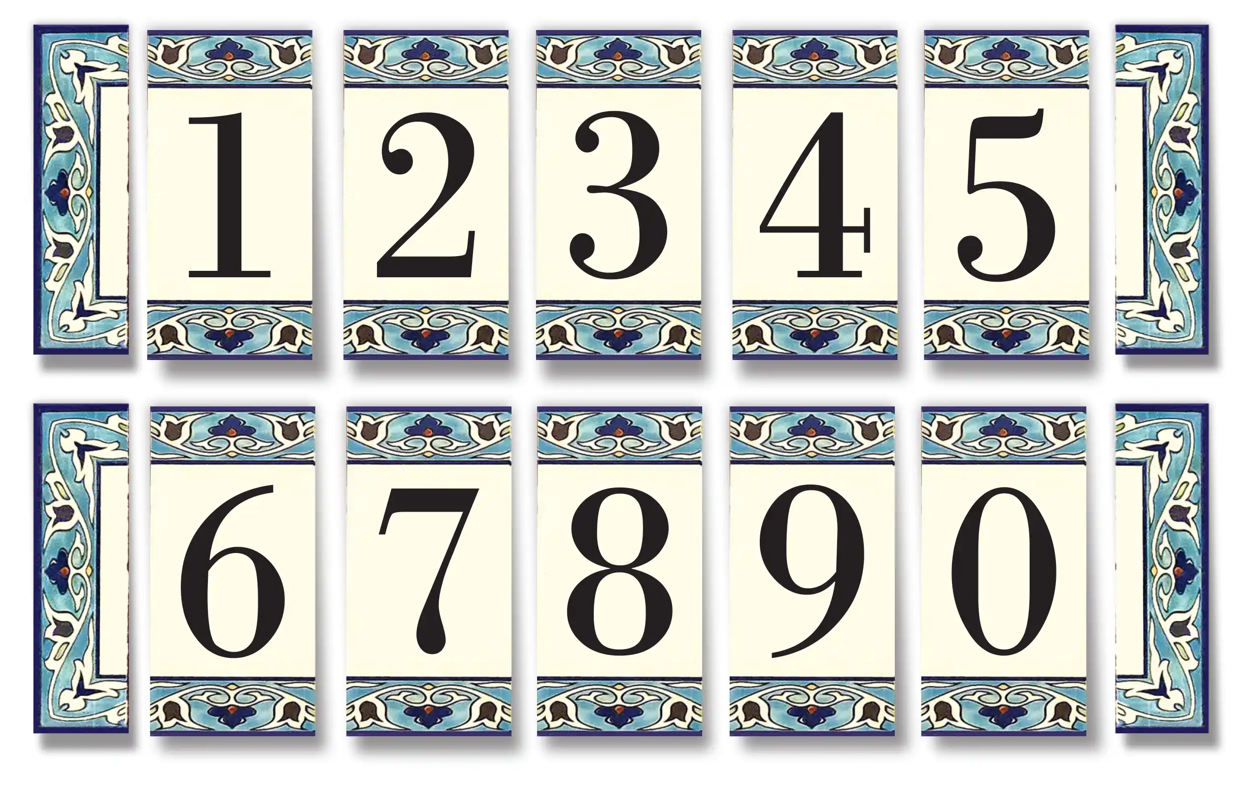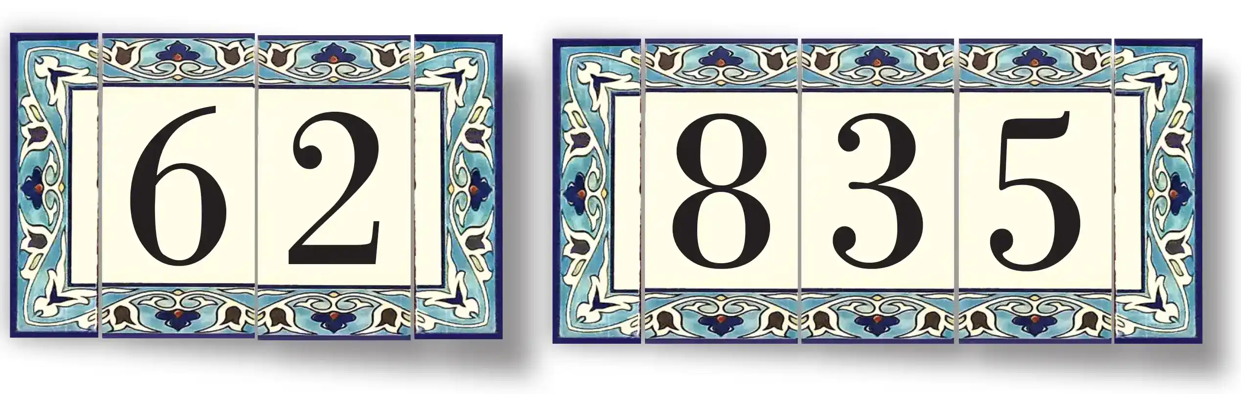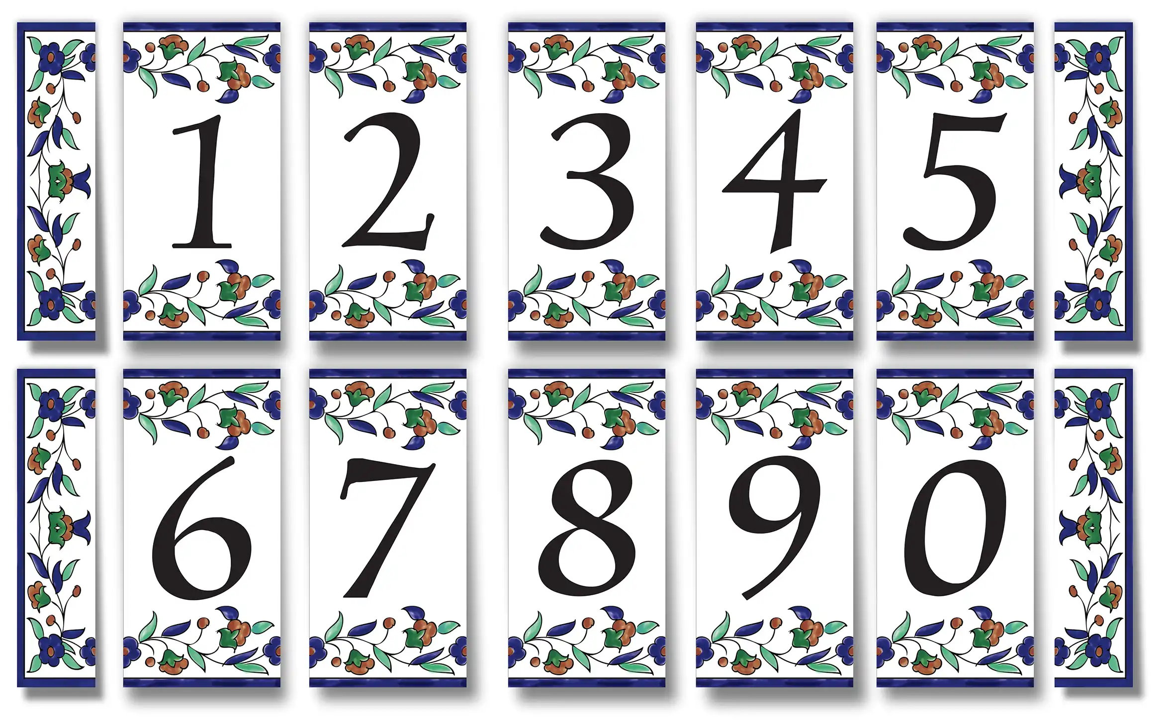 Address Plaques made of hand-decorated ceramics and fired to 1000 °C.  Send us the style number and desired inscription. We will send a layout for your approval. Optional languages and fonts available for the ceramic address plaques.