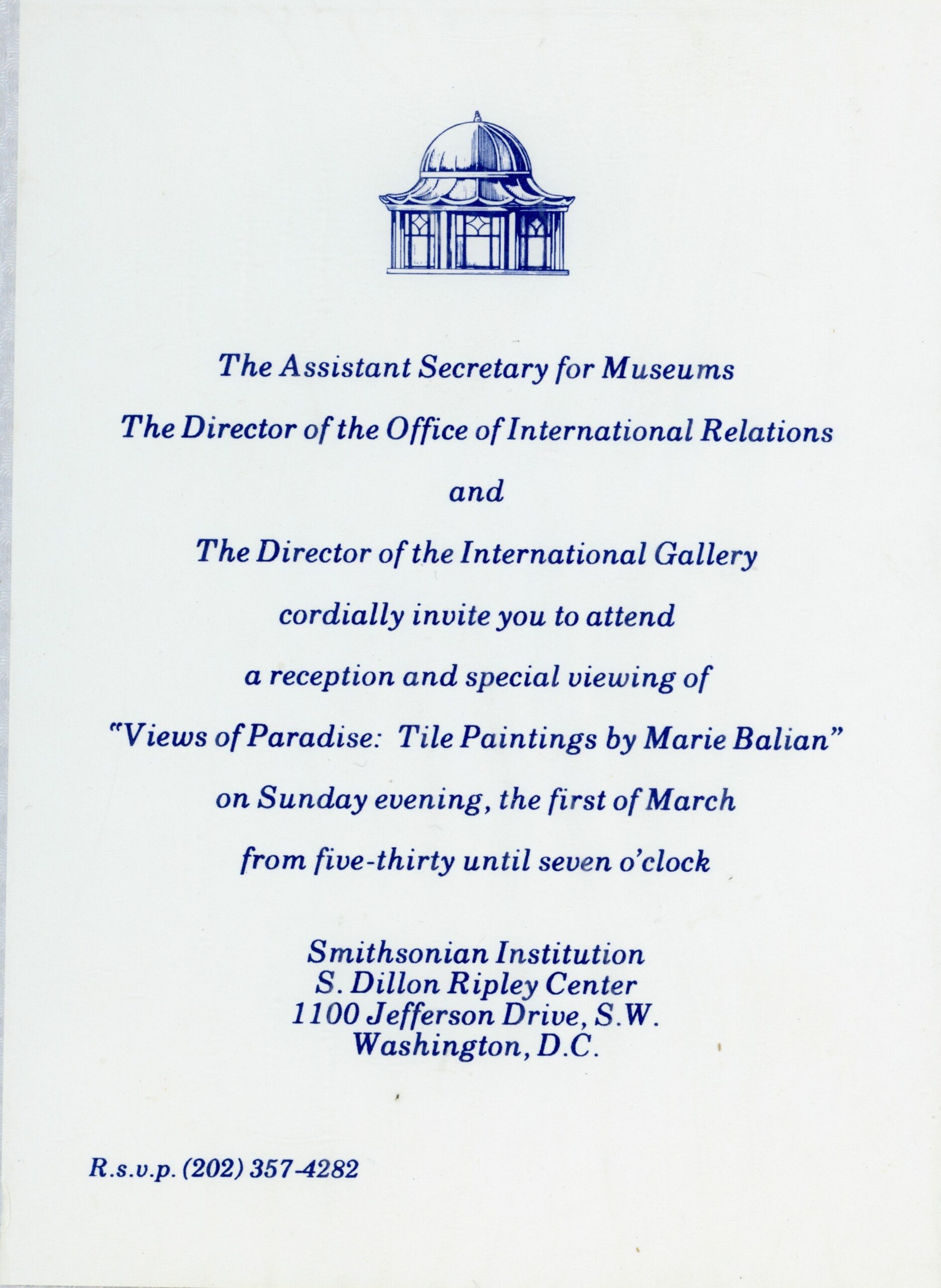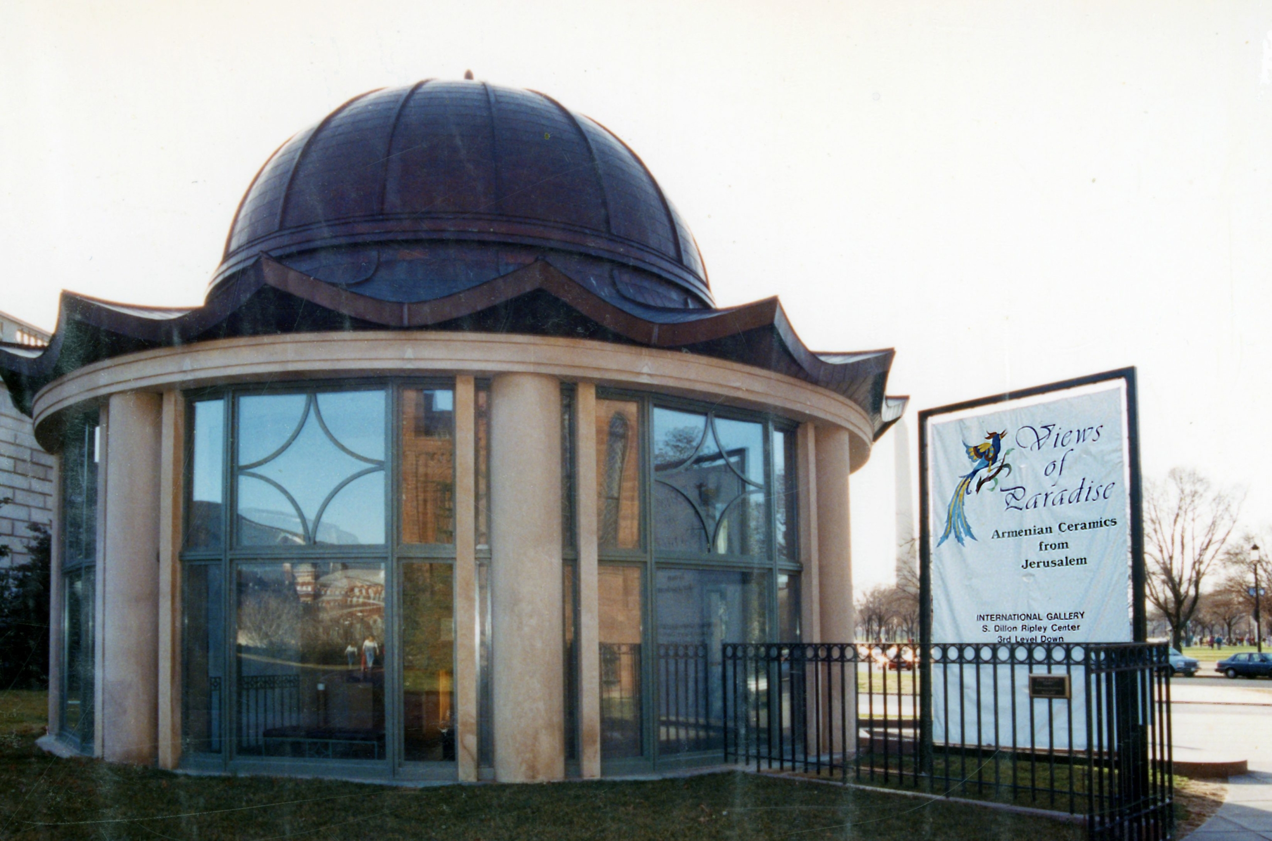 In 1992, the Smithsonian Museum of Washington D.C. hosted a special exhibition featuring the ceramic tile murals of Marie Balian and the Armenian Ceramics of Jerusalem. The exquisite tile murals from the Balian studio were showcased at the Dillon Ripley Center. Originally scheduled for a three-month run, the exhibition's immense popularity prompted a three-month extension. Below, you'll find images capturing the exterior of the museum and the captivating tile murals housed within the Dillon Ripley Center.